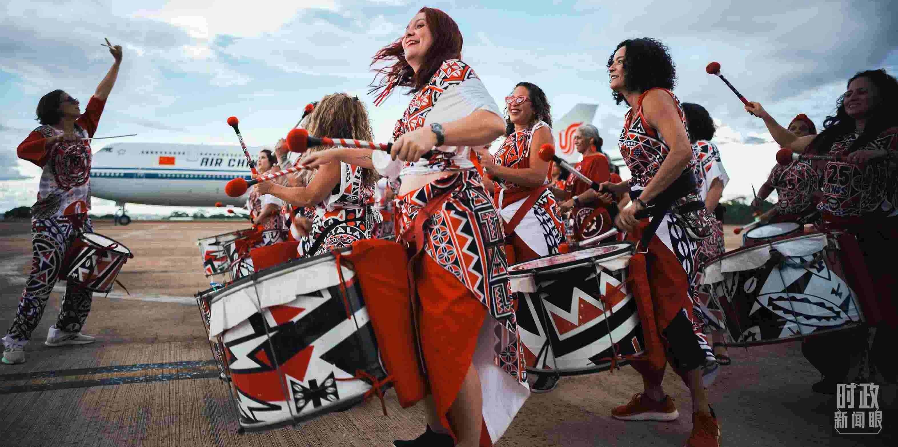 △習(xí)主席乘專機(jī)抵達(dá)巴西利亞,藝術(shù)家演奏特色鼓樂。(總臺(tái)央視記者彭漢明拍攝)