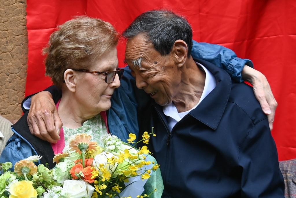 2024年4月17日,在浙江衢州江山市張村鄉(xiāng)龍頭店村,“杜立特行動(dòng)”3號(hào)機(jī)領(lǐng)航員查爾斯·奧祖克的女兒蘇珊·奧祖克(左)與村民廖明發(fā)相擁。1942年,村民廖詩原(廖明發(fā)的父親)一家曾悉心照顧跳傘降落的查爾斯·奧祖克。新華社記者 黃宗治 攝