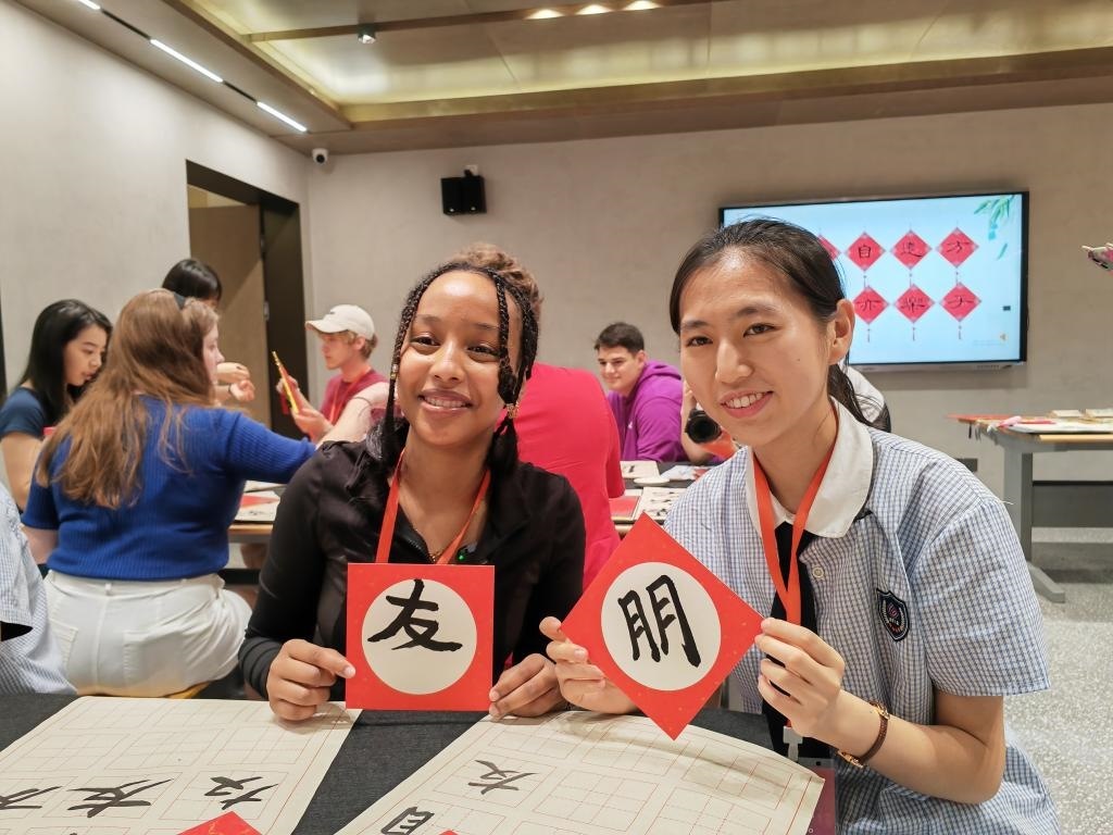 2024年6月8日,在河北省石家莊外國(guó)語學(xué)校,美國(guó)山谷高中學(xué)生娜斯拉(左一)在上漢字書法課。新華社記者 杜一方 攝