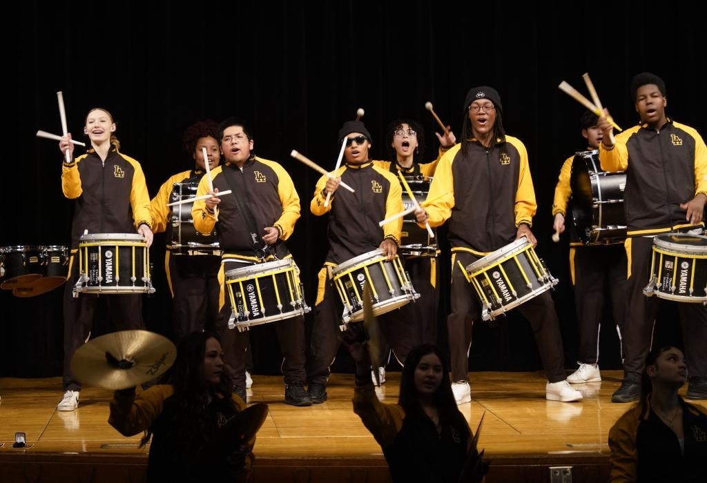 2024年1月30日,在美國(guó)華盛頓州林肯中學(xué),學(xué)校鼓樂隊(duì)在美國(guó)中學(xué)生赴華交流歡送儀式上表演。新華社記者 吳曉凌 攝