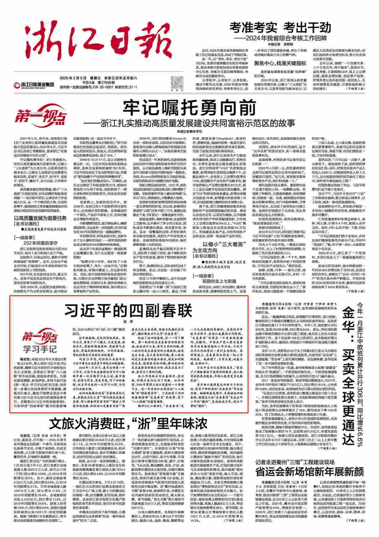 把工作的要求寫(xiě)在春聯(lián)里,很別致,但絕不是僅僅為了別致。如今回望,2004年算得上浙江發(fā)展的一個(gè)重要節(jié)點(diǎn)。這一年是浙江全面實(shí)施“八八戰(zhàn)略”的“狠抓落實(shí)年”。于是就有了用四副春聯(lián)詮釋“求真務(wù)實(shí)”的故事,有了“八八戰(zhàn)略”的落筆鋪陳。