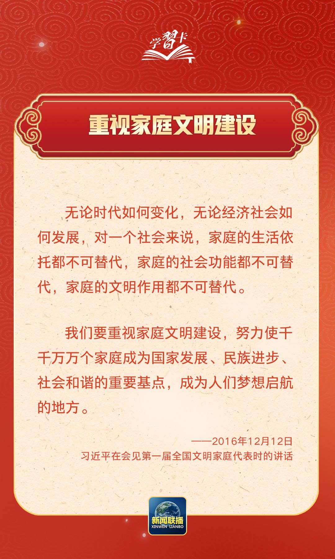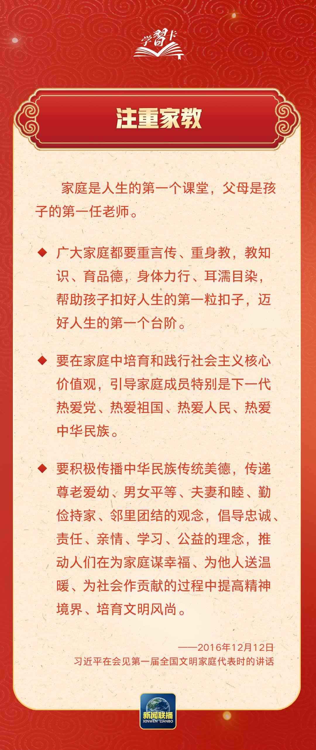 在習(xí)近平總書記心中,家國(guó)的分量很重。他多次強(qiáng)調(diào)要重視家庭建設(shè),提倡愛家愛國(guó)相統(tǒng)一,指出廣大家庭都要弘揚(yáng)優(yōu)良家風(fēng),以千千萬(wàn)萬(wàn)家庭的好家風(fēng)支撐起全社會(huì)的好風(fēng)氣。近日,《求是》雜志發(fā)表習(xí)近平總書記重要文章《注重家庭,注重家教,注重家風(fēng)》,一起學(xué)習(xí)↓