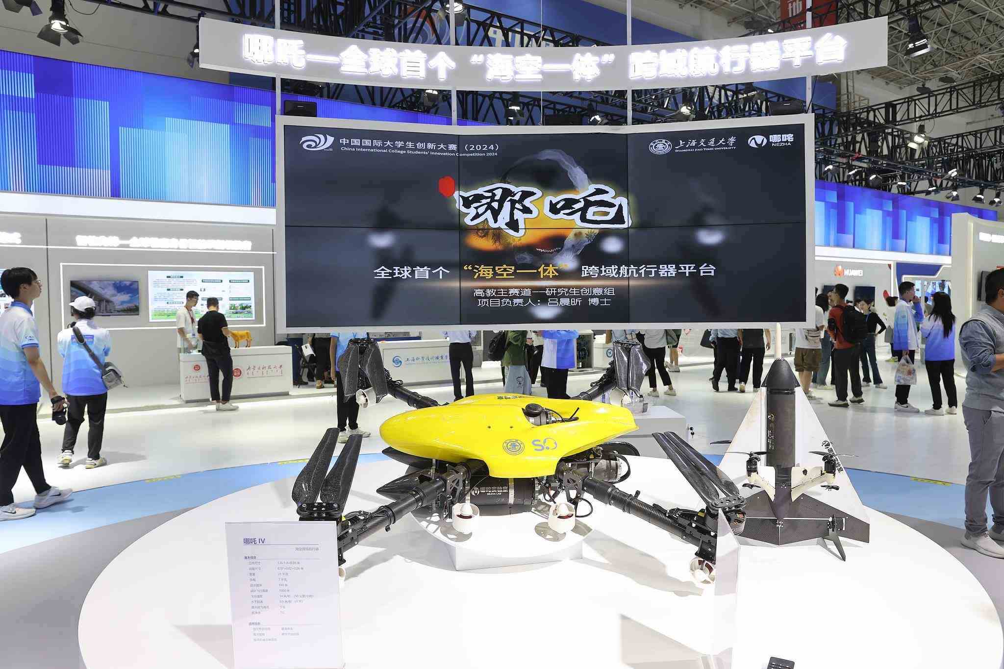 △2024年10月12日至15日,中國國際大學生創(chuàng)新大賽總決賽及同期活動在上海舉行。來自上海交通大學的“哪吒——全球首個‘??找惑w’跨域航行器平臺”項目奪得冠軍。