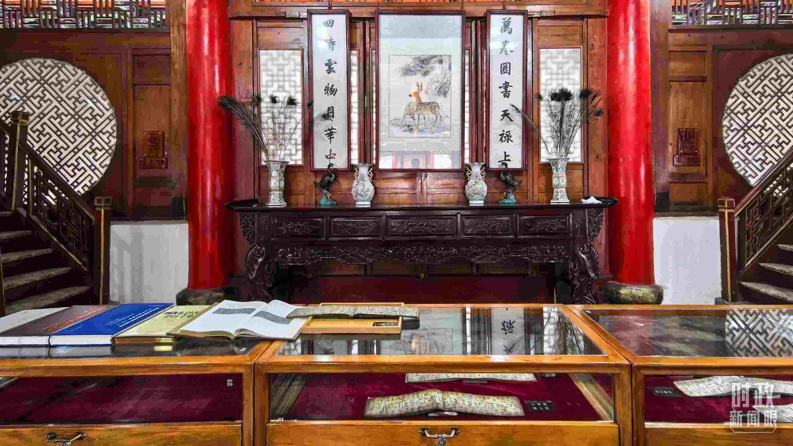 △木府萬卷樓里的書籍和文物展陳。(總臺央視記者陸泓宇拍攝)