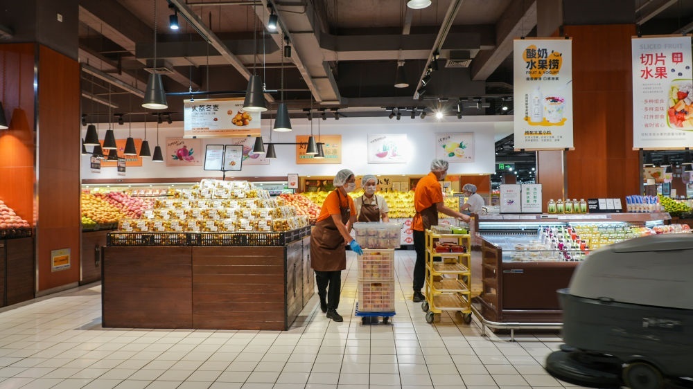 在河南許昌的胖東來生活廣場店內(nèi),店員正在做當(dāng)天開業(yè)前的準(zhǔn)備工作。新華社記者 劉振坤 攝