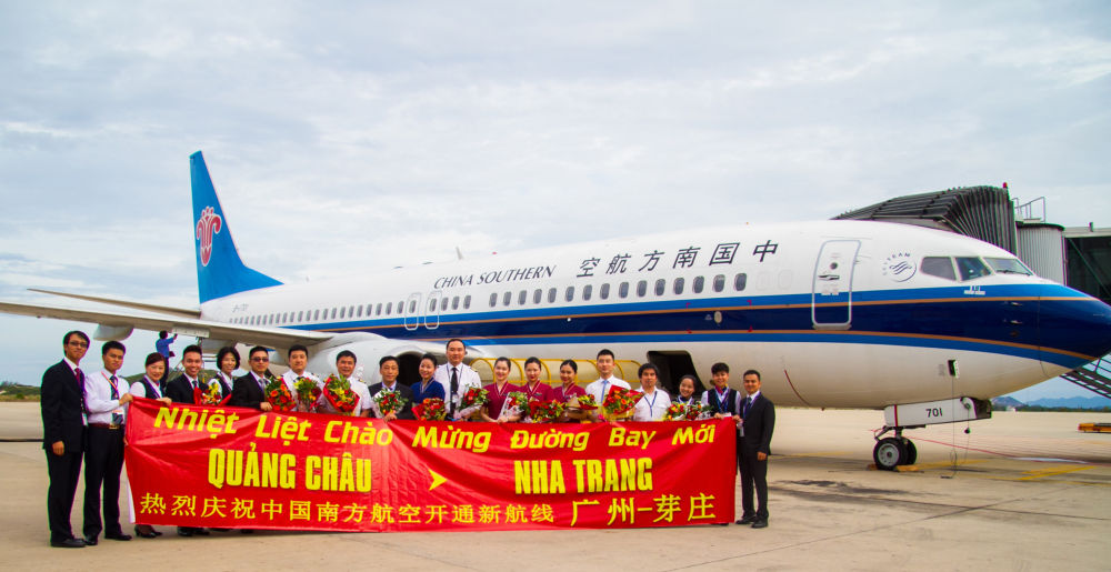 2015年6月20日,中國南航廣州至越南芽莊首航成功,機(jī)組人員在抵達(dá)越南金蘭國際機(jī)場后合影。