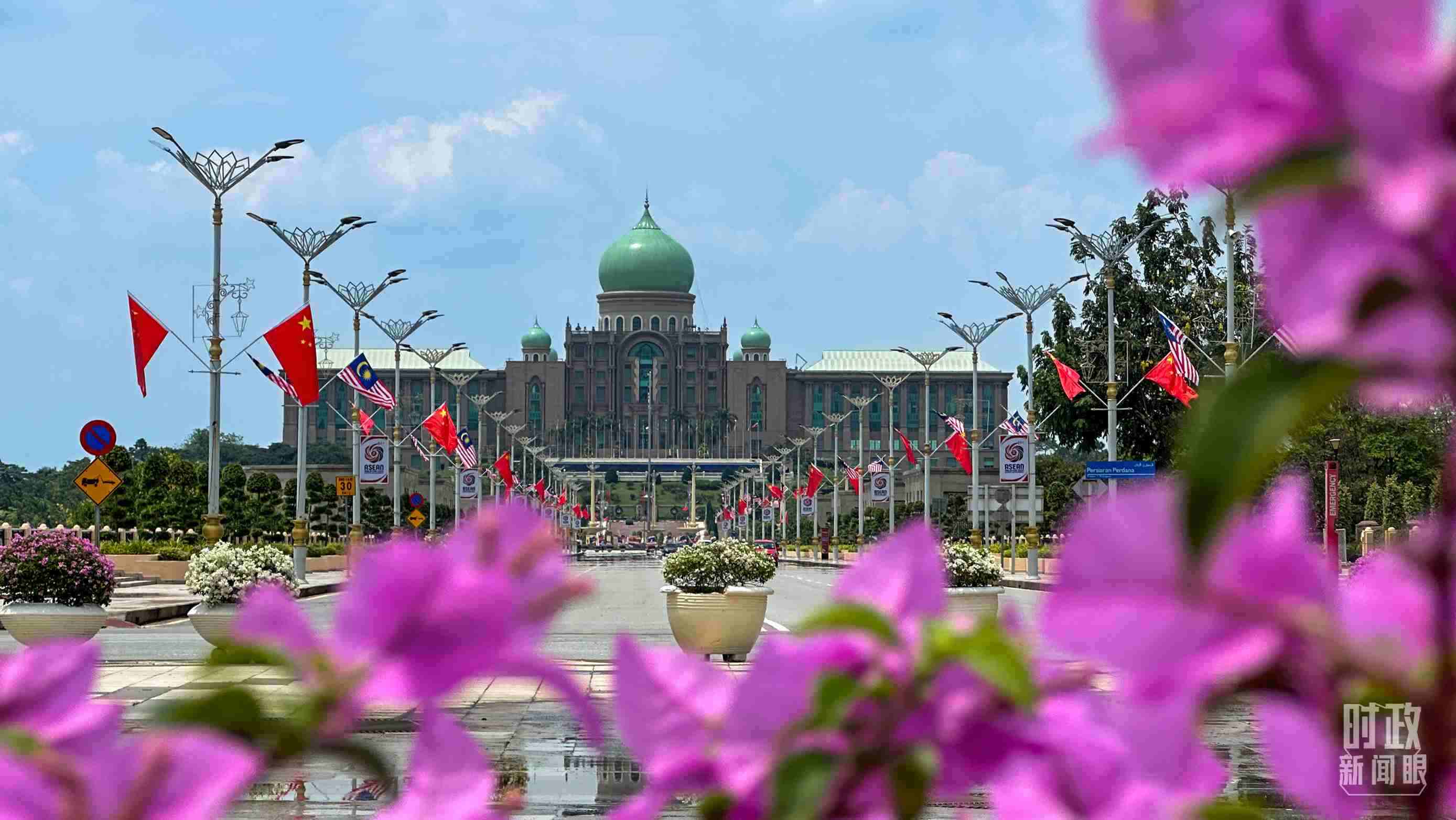 △馬來(lái)西亞總理府前懸掛的中馬兩國(guó)國(guó)旗。(總臺(tái)央視記者關(guān)舟拍攝)