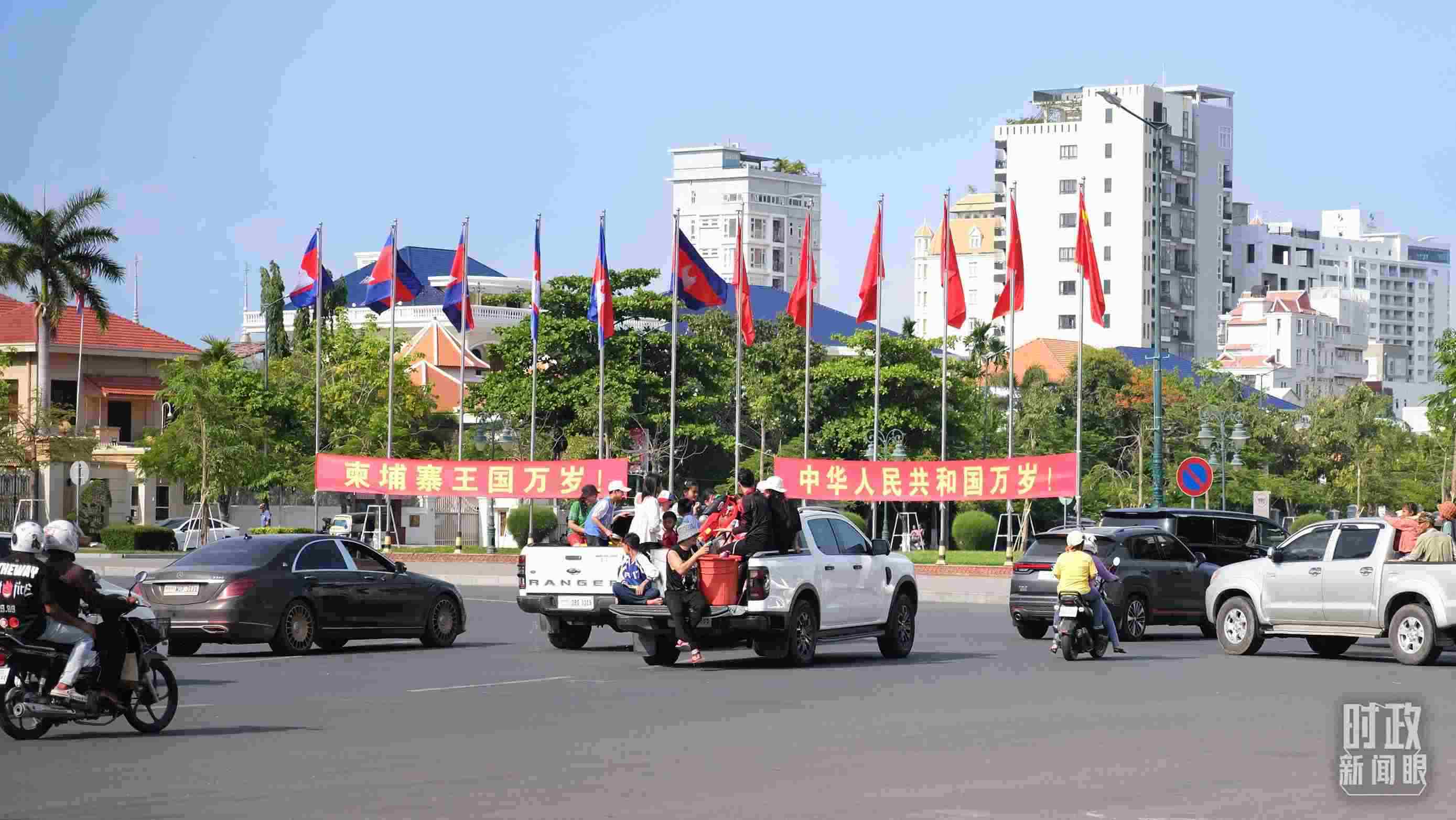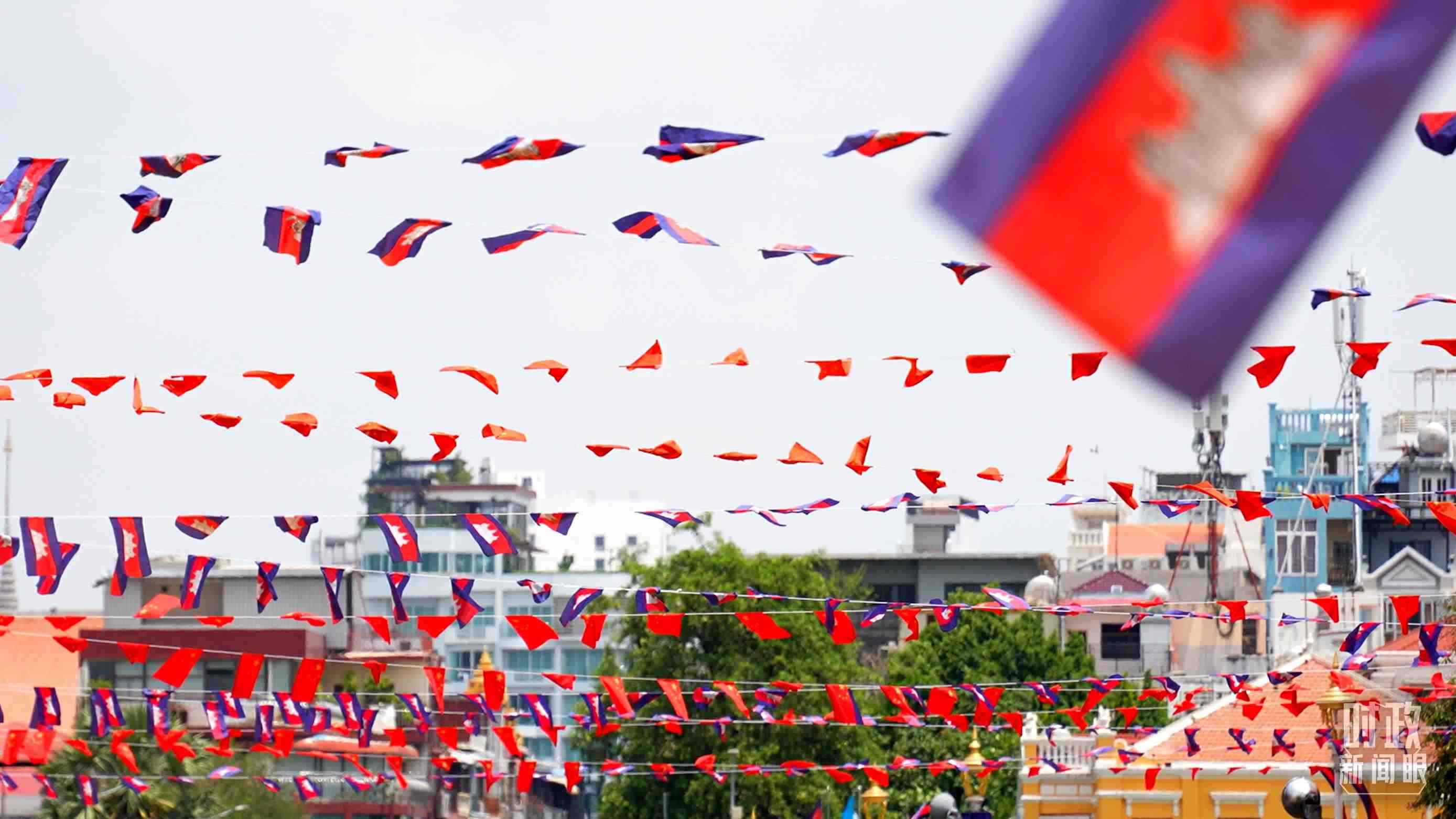 △金邊街頭懸掛的中柬兩國國旗。(總臺央視記者盧心雨拍攝)