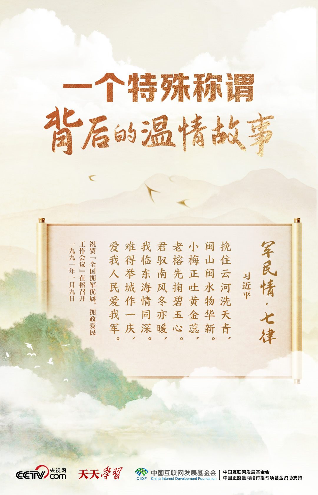 當(dāng)年在福州工作時,習(xí)近平曾賦詩《軍民情·七律》,表達了他對軍隊的深情:“君馭南風(fēng)冬亦暖,我臨東海情同深。難得舉城作一慶,愛我人民愛我軍?!?/p>