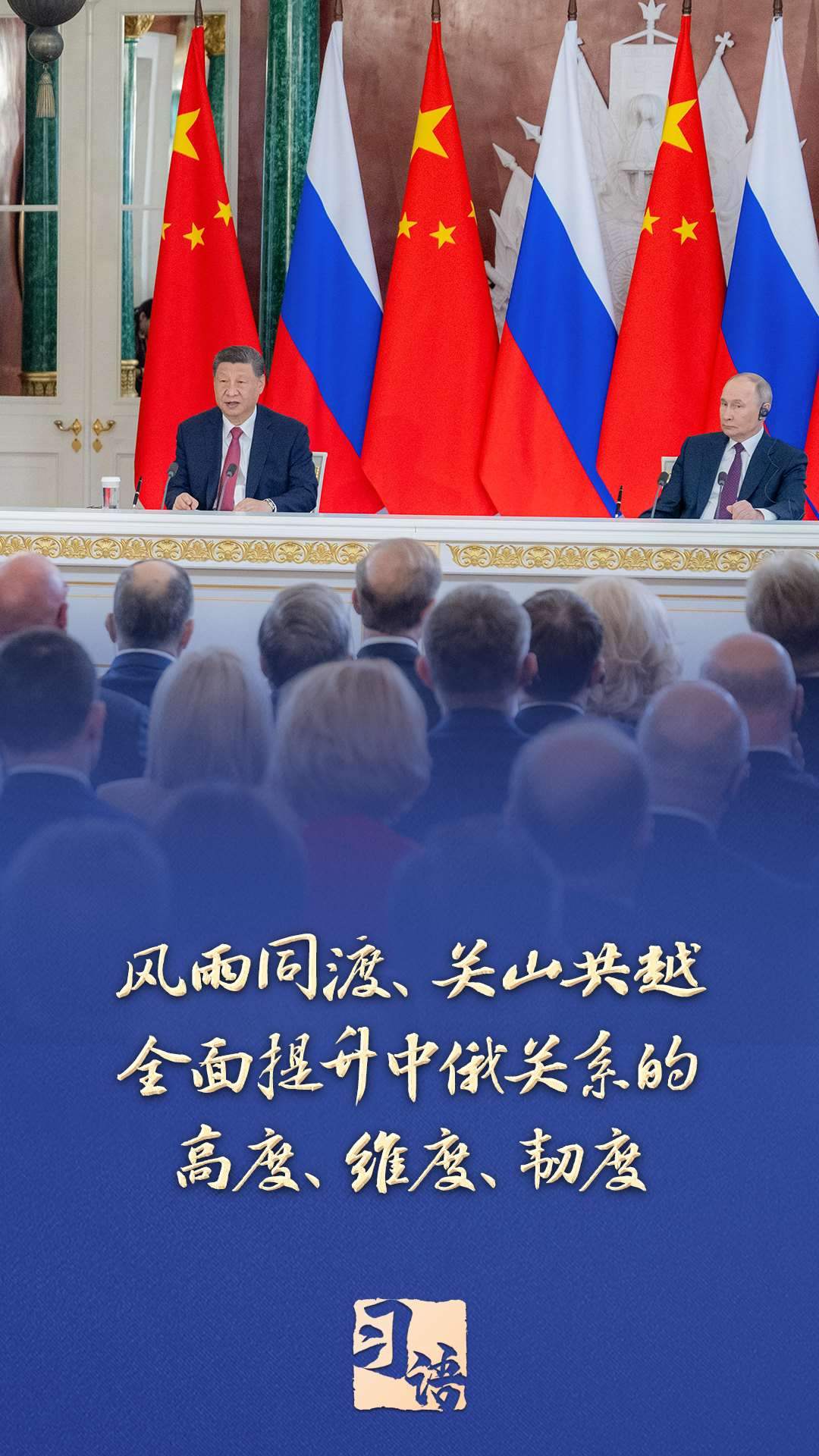 “面對變亂交織的國際形勢,中俄兩國要堅定秉持永久睦鄰友好、全面戰(zhàn)略協(xié)作、互利合作共贏精神,風雨同渡、關(guān)山共越,全面提升中俄關(guān)系的高度、維度、韌度,為世界和平和安全注入更多穩(wěn)定性,為全球發(fā)展繁榮提供更強推動力?!碑?shù)貢r間5月8日,習近平在同俄羅斯總統(tǒng)普京共同會見記者時指出。