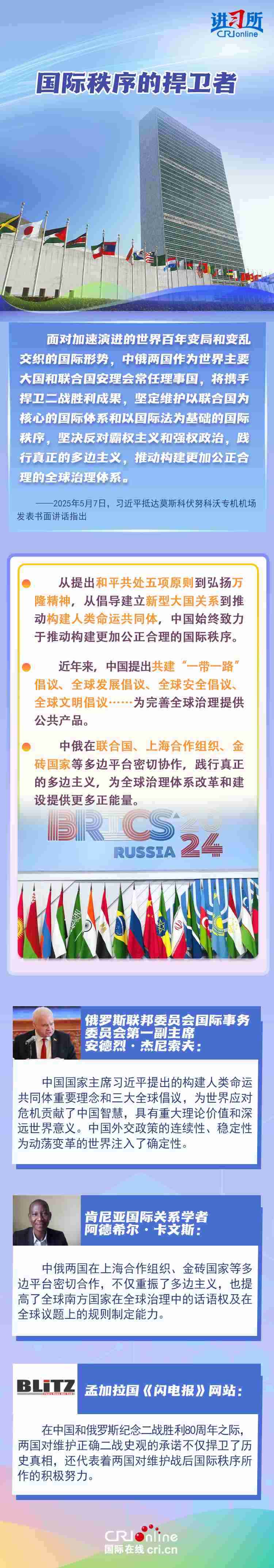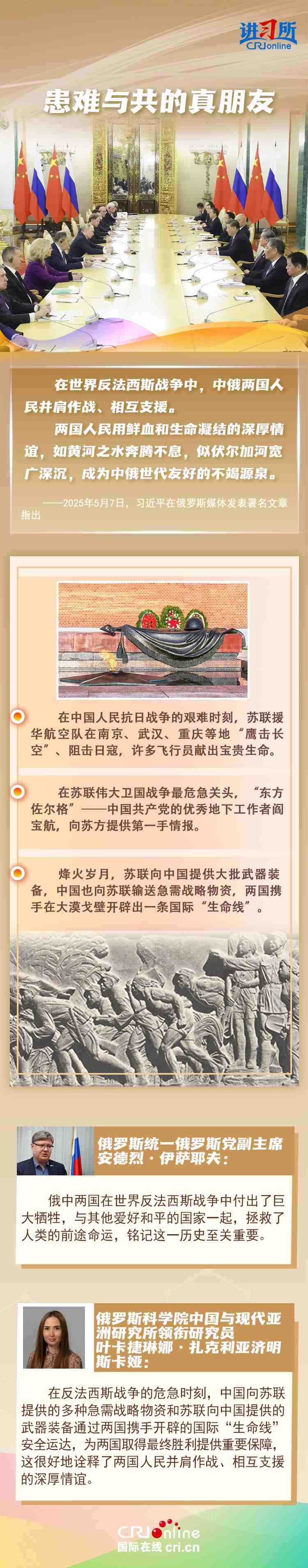 “兩國人民用鮮血和生命凝結(jié)的深厚情誼,如黃河之水奔騰不息,似伏爾加河寬廣深沉,成為中俄世代友好的不竭源泉。”今年是中國人民抗日戰(zhàn)爭、蘇聯(lián)偉大衛(wèi)國戰(zhàn)爭暨世界反法西斯戰(zhàn)爭勝利80周年,也是聯(lián)合國成立80周年。在這一重要歷史時間節(jié)點,習(xí)近平主席此訪不僅為中俄關(guān)系發(fā)展注入強勁動力,也向世界宣示中俄兩國攜手捍衛(wèi)二戰(zhàn)勝利成果的堅定意志。