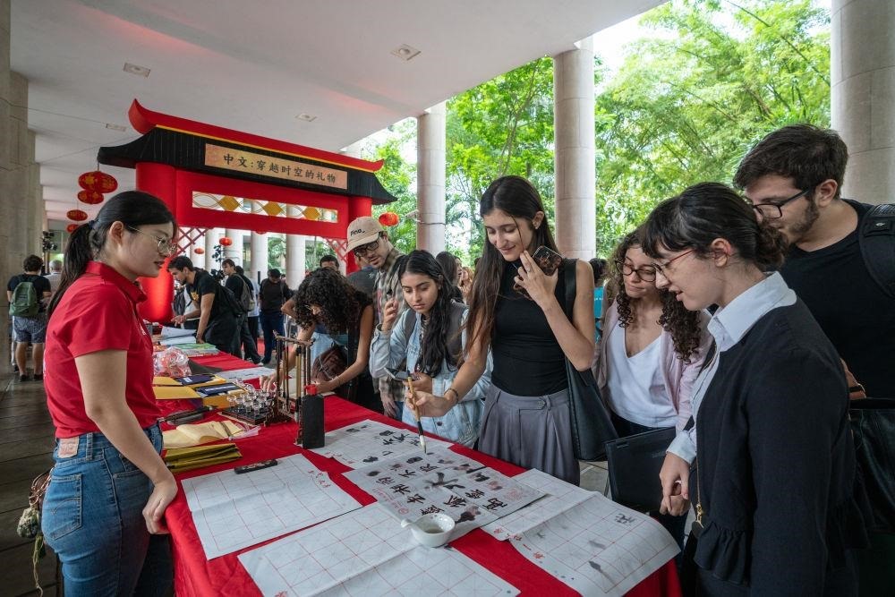 △2025年4月,在巴西里約熱內(nèi)盧天主教大學(xué)舉辦的“國際中文日”慶?;顒由?,學(xué)生們體驗中文書法。