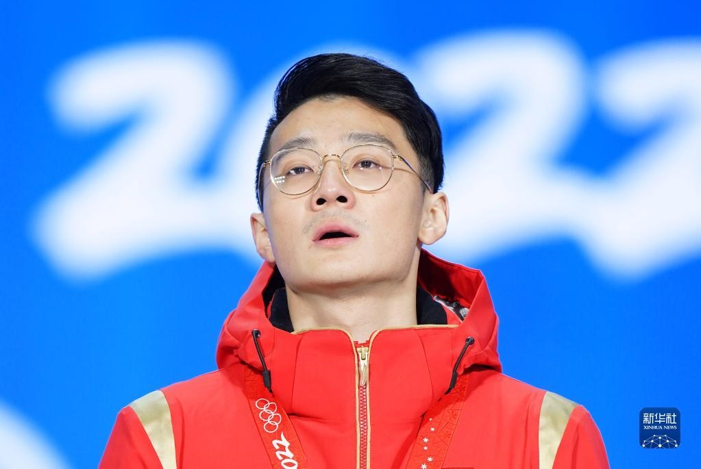 2月8日,冠軍中國隊選手任子威在獎牌頒發(fā)儀式上。