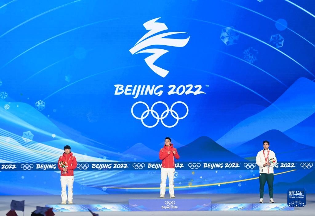 當日,北京2022年冬奧會短道速滑男子1000米獎牌頒發(fā)儀式在北京賽區(qū)頒獎廣場舉行。