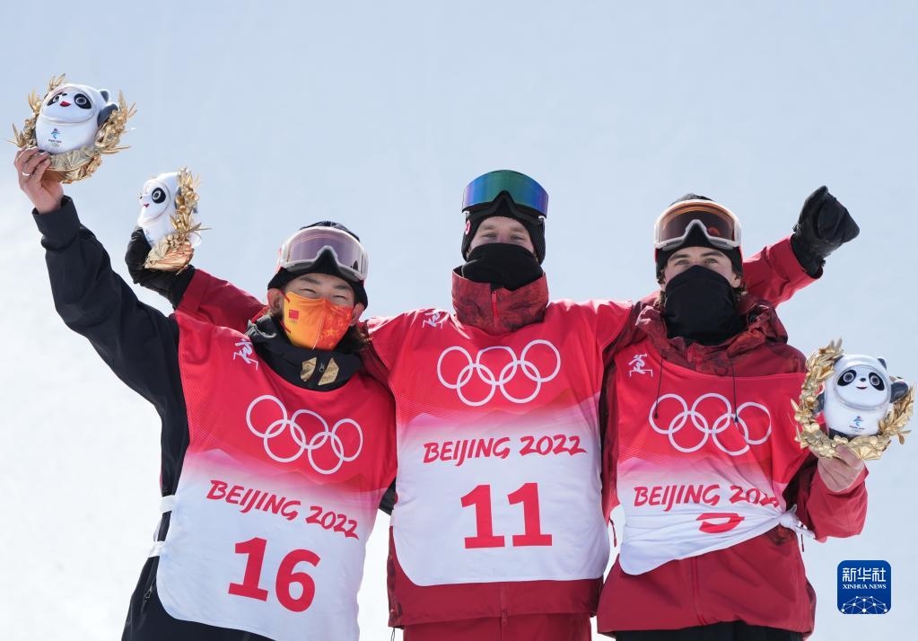 2月7日,獲得冠軍的加拿大選手馬克斯·帕羅特(中),獲得亞軍的中國(guó)選手蘇翊鳴(左)和獲得季軍的加拿大選手馬克·麥克莫里斯在頒發(fā)紀(jì)念品儀式上。新華社記者楊世堯攝