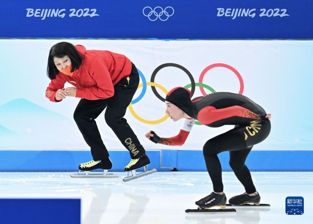 2月10日,教練在場(chǎng)邊指導(dǎo)中國(guó)選手韓梅(右)。