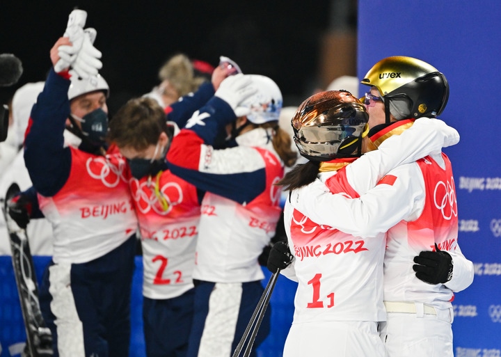 2月10日,賈宗洋(右)與徐夢桃賽后擁抱,美國隊(duì)在他們身后慶祝奪冠。新華社記者朱崢攝