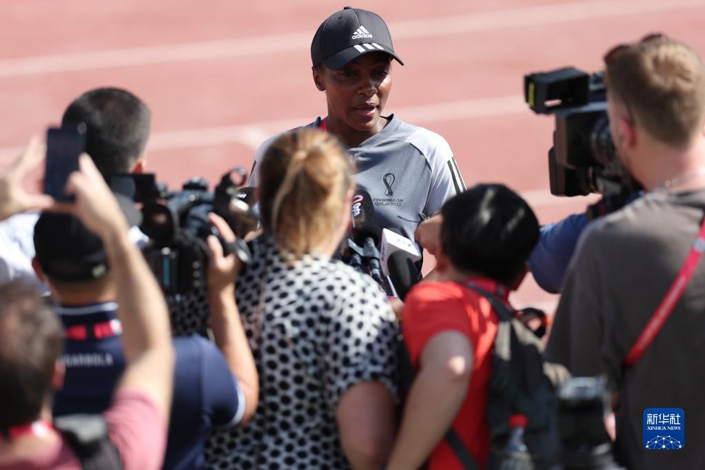 11月18日,盧旺達(dá)女主裁穆坎桑加(后)在訓(xùn)練前接受采訪。本屆世界杯將首次出現(xiàn)由女主裁執(zhí)法比賽。新華社記者 賈浩成 攝