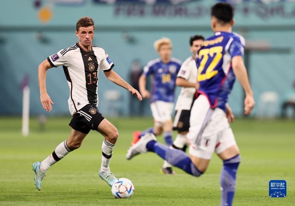 11月23日,德國(guó)隊(duì)球員托馬斯·穆勒(左)在比賽中進(jìn)攻。新華社記者 蘭紅光 攝