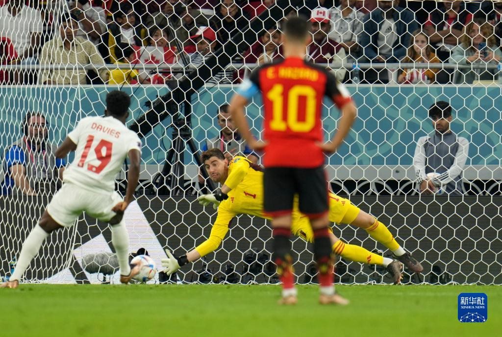 11月23日,比利時(shí)隊(duì)守門員庫爾圖瓦(后)在比賽中撲出加拿大隊(duì)球員阿方索·戴維斯(左)的點(diǎn)球。新華社記者 孟鼎博 攝