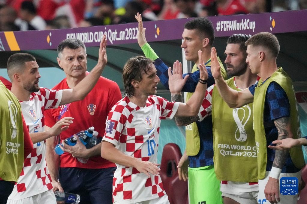 11月27日,克羅地亞隊(duì)球員莫德里奇(左三)在比賽中被替換下場(chǎng)后與隊(duì)友致意。