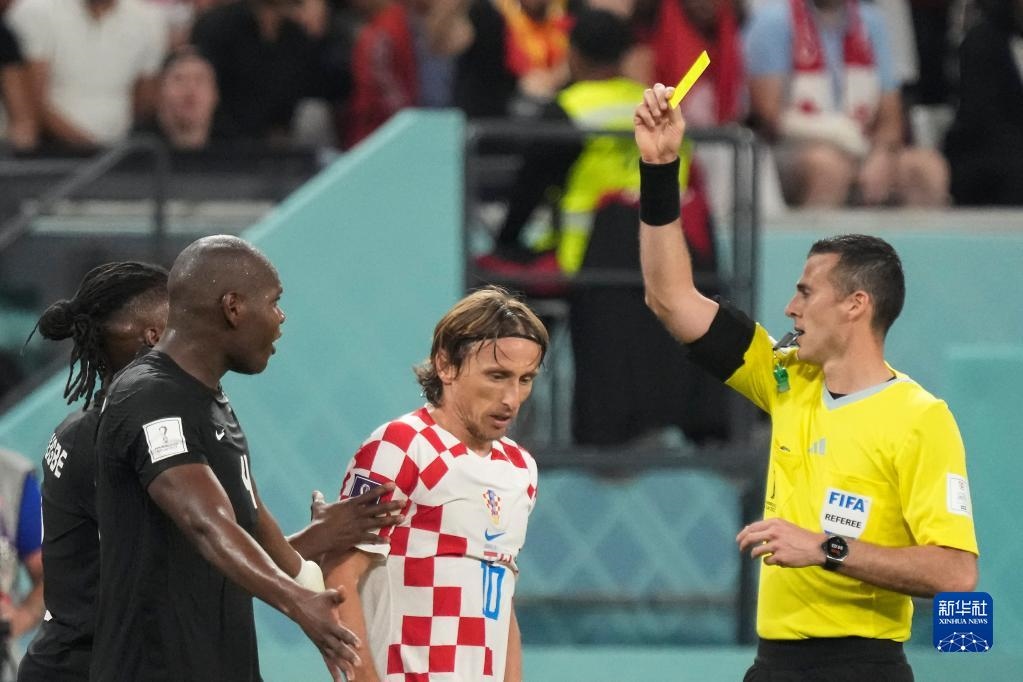 11月27日,主裁判在比賽中向克羅地亞隊(duì)球員莫德里奇(右二)與加拿大隊(duì)球員卡馬爾·米勒(右三)出示黃牌。