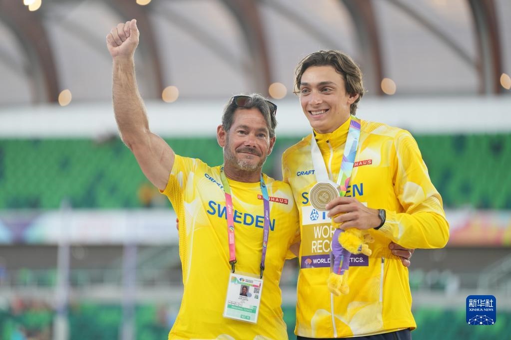 這是2022年7月24日,杜普蘭蒂斯(右)在俄勒岡田徑世錦賽男子撐桿跳高頒獎儀式上和父親兼教練格雷戈里合影。新華社記者 吳曉凌 攝