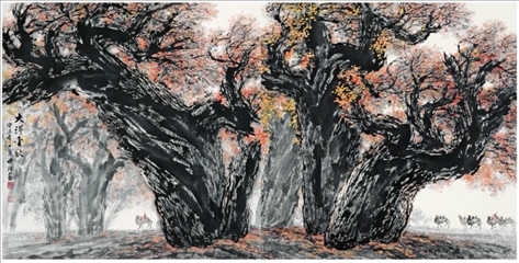 梁先生曾旅居西藏四個月,不僅為人民大會堂西藏廳創(chuàng)作了巨幅國畫《雪山雄鷹》,同時收獲了數(shù)百張速寫和寫生稿。他還四上黃山,兩次到三峽。2000年,70多歲的梁世雄又深入新疆無人區(qū)胡楊林中進行素材收集。此后,大漠胡楊成了梁世雄作品新的視覺符號。