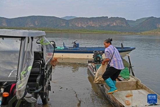運江古鎮(zhèn)的居民從船上搬運魚貨(10月11日攝)。