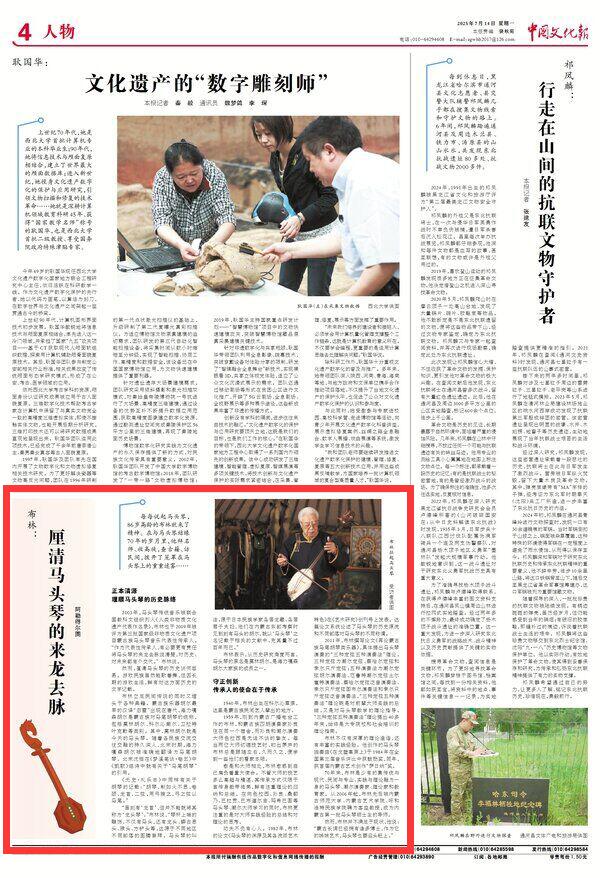 2025年7月14日《中國文化報》第4版刊發(fā)了題為《布林:厘清馬頭琴的來龍去脈》的文章,報道了做為非物質(zhì)文化遺產(chǎn)項目蒙古族馬頭琴音樂代表性傳承人的布林立足民間傳說的同時又埋頭于各種典籍。他說作為代表性傳承人,有必要更有責(zé)任將馬頭琴的來龍去脈說清楚,對歷史、對未來都有個交代。