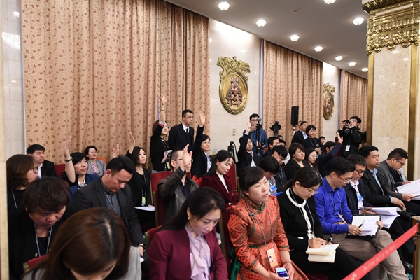 3月6日下午,十三屆全國人大二次會議內(nèi)蒙古代表團(tuán)舉行全團(tuán)會議,審議政府工作報告并向境內(nèi)外媒體開放。來自17個國家和地區(qū)的78家媒體、90名記者到場采訪。內(nèi)蒙古日報社融媒體記者 袁永紅 攝