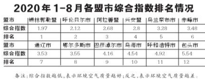 2020年1-8月,全區(qū)環(huán)境空氣質(zhì)量達(dá)標(biāo)天數(shù)比例平均為88.6%。12個盟市達(dá)標(biāo)天數(shù)比例由高至低依次為:呼倫貝爾市(100.0%)、錫林郭勒盟(98.8%)、興安盟(95.9%)、赤峰市(93.4%)、烏蘭察布市(93.4%)、阿拉善盟(92.6%)、鄂爾多斯市(88.5%)、通遼市(88.1%)、巴彥淖爾市(81.0%)、烏海市(79.1%)、包頭市(76.2%)和呼和浩特市(76.2%)。