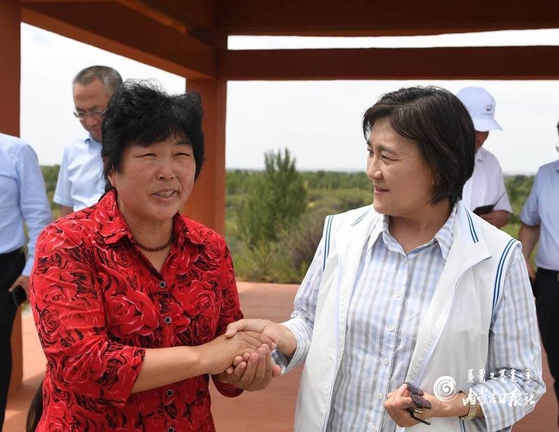 烏蘭陶勒蓋治沙站位于烏審旗毛烏素沙地腹部,建站40多年來,以治沙造林、保護森林資源為己任,一代接著一代干,防沙治沙工作取得了明顯成效。布小林來到烏蘭陶勒蓋治沙站,調(diào)研治沙造林工作,并與全國“三八·綠色獎?wù)隆鲍@得者殷玉珍親切交流,對當(dāng)?shù)厣鷳B(tài)治理的模式和成效給予肯定。她還來到伊金霍洛旗紅慶河鎮(zhèn),考察鄉(xiāng)村治理、消費扶貧等工作。