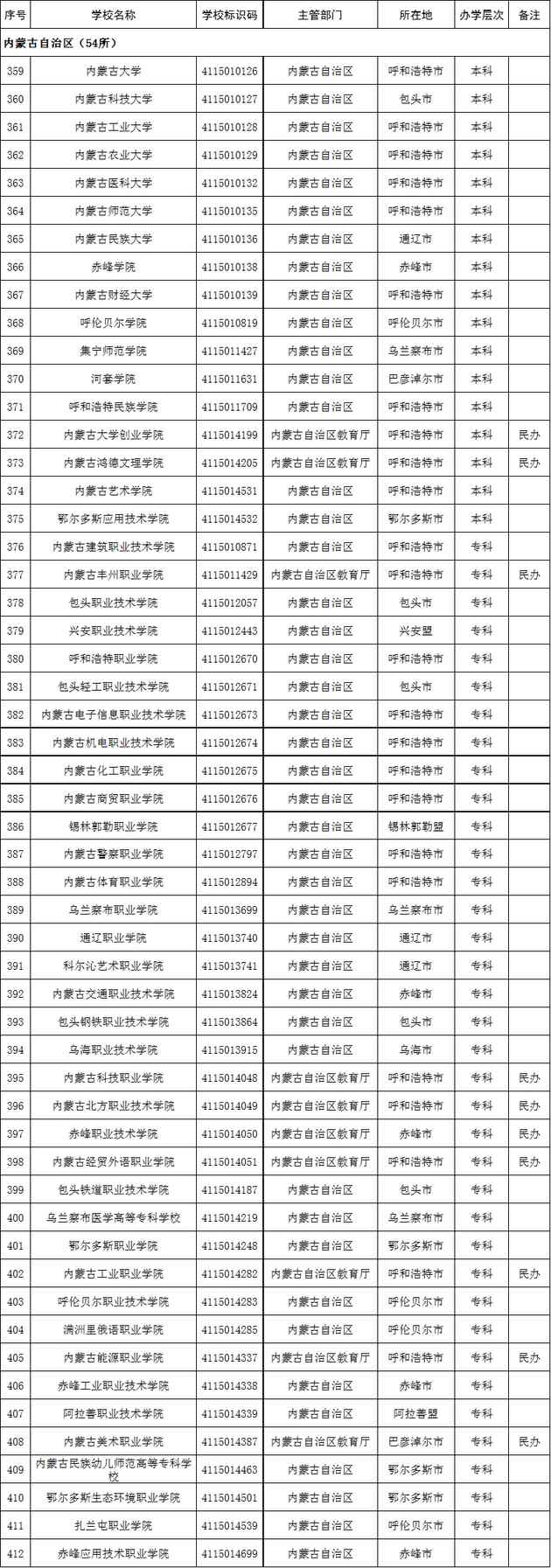 截至2020年6月30日,全國高等學(xué)校共計(jì)3005所,其中:普通高等學(xué)校2740所,含本科院校1258所、高職(??疲┰盒?482所;成人高等學(xué)校265所。本名單未包含港澳臺(tái)地區(qū)高等學(xué)校。以下為內(nèi)蒙古自治區(qū)2020年普通高等學(xué)校名單(54所)。