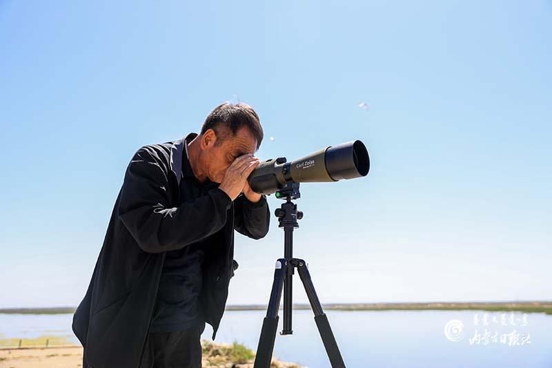 烈日下 ,通過(guò)高倍望 遠(yuǎn)鏡觀察鳥(niǎo)類活動(dòng)情況。