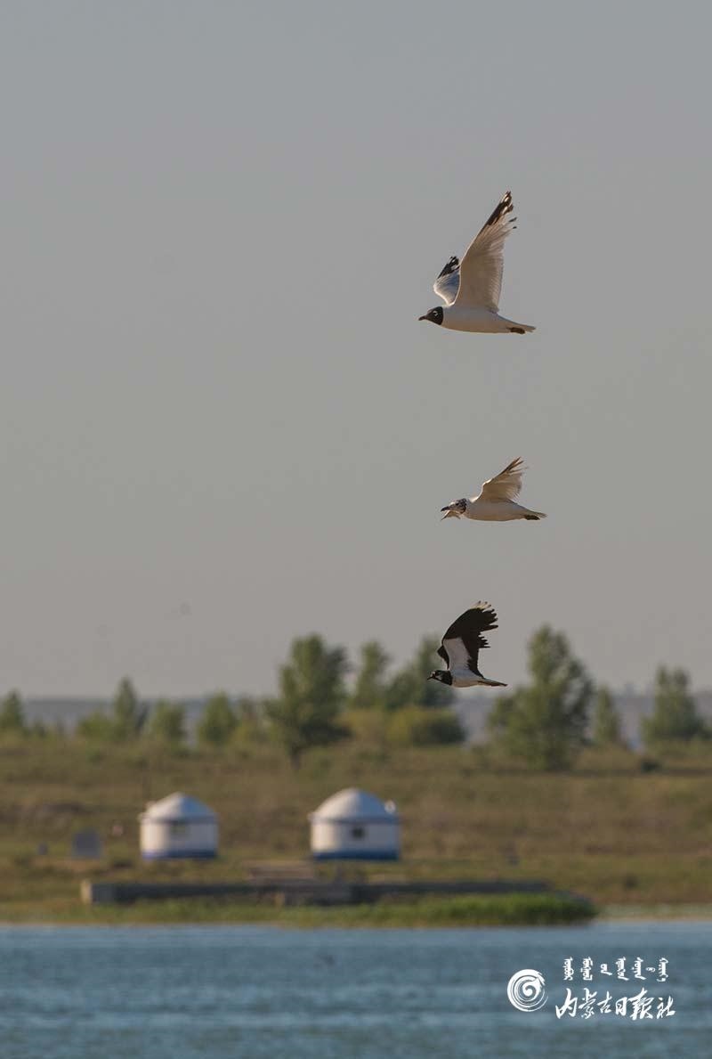 遺鷗掠過(guò)水面,與遠(yuǎn)處的蒙古包相映成趣。