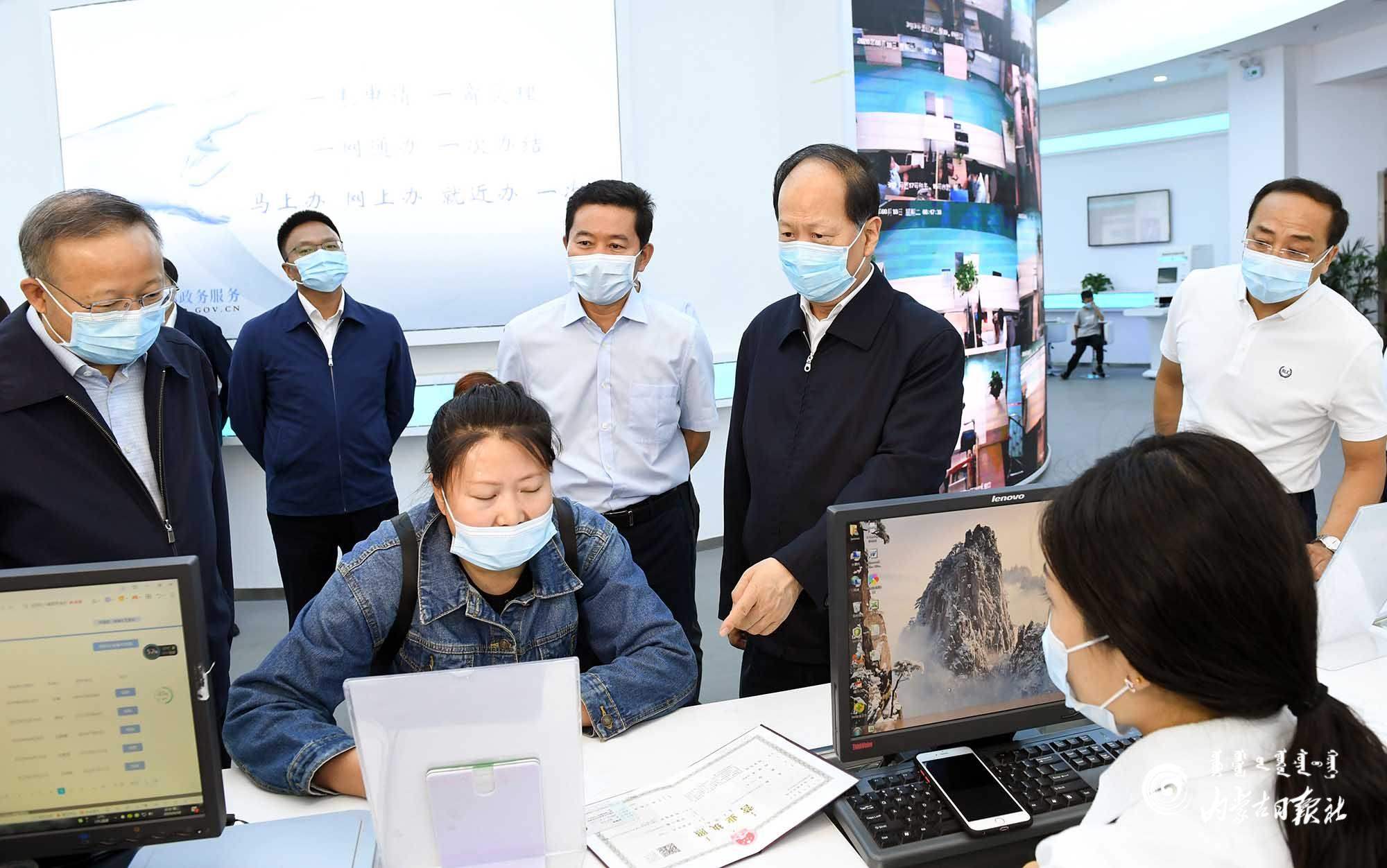 8月18日,自治區(qū)黨委書記、人大常委會主任石泰峰來到巴彥淖爾市臨河區(qū)市政服務中心,了解正在辦理企業(yè)注冊服務平臺流程。內(nèi)蒙古日報記者 袁永紅 攝