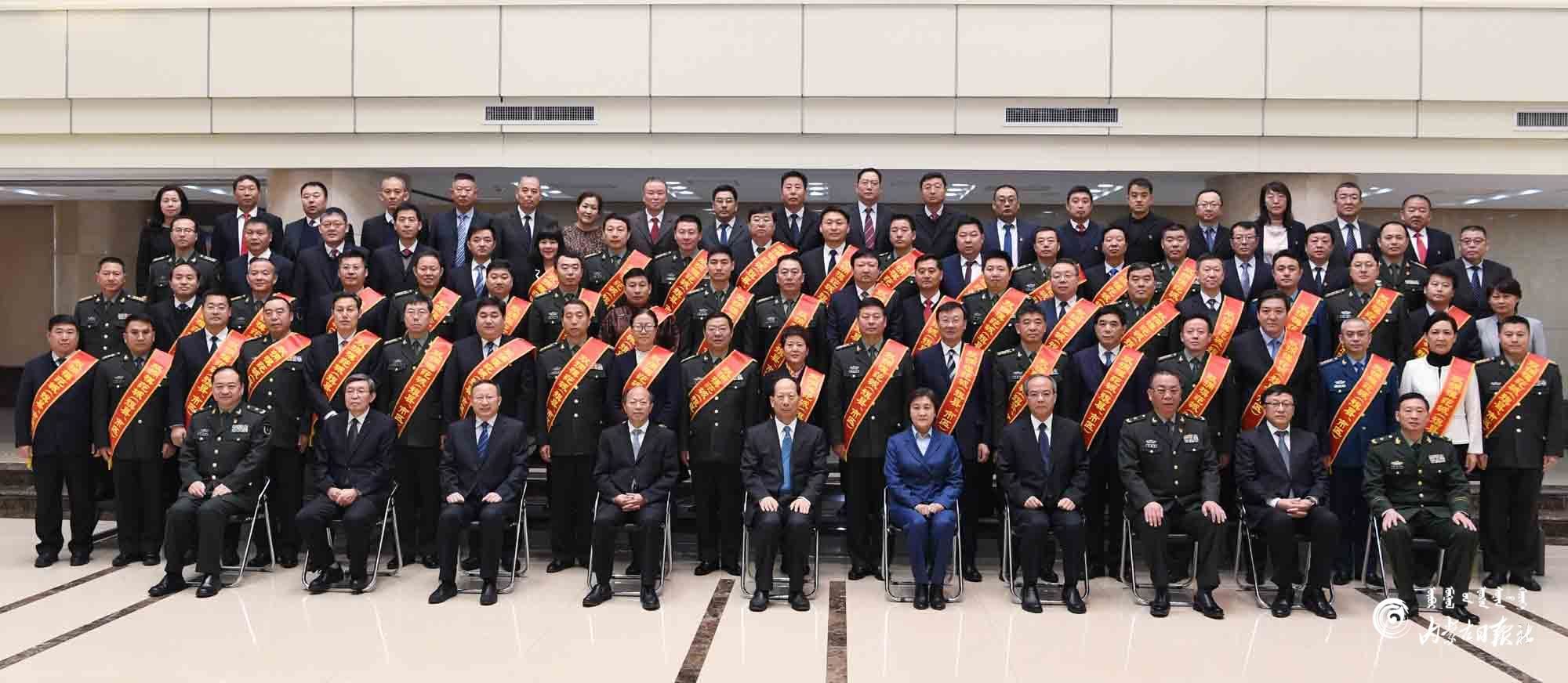 12月22日,石泰峰、布小林、李秀領(lǐng)等自治區(qū)領(lǐng)導(dǎo)在呼和浩特會(huì)見內(nèi)蒙古自治區(qū)雙擁模范城(旗縣、市區(qū))命名大會(huì)參會(huì)代表并合影。內(nèi)蒙古日?qǐng)?bào)記者 袁永紅 攝