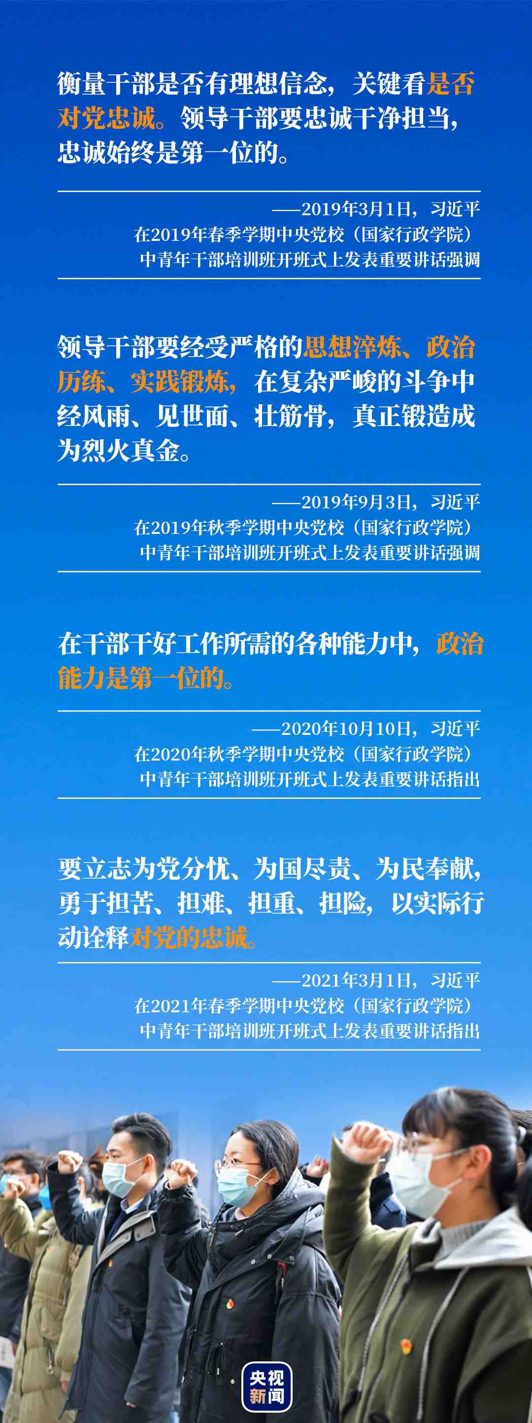 對黨忠誠、提高政治能力是總書記在近幾年中青年干部培訓班開班式上授課的關鍵詞。