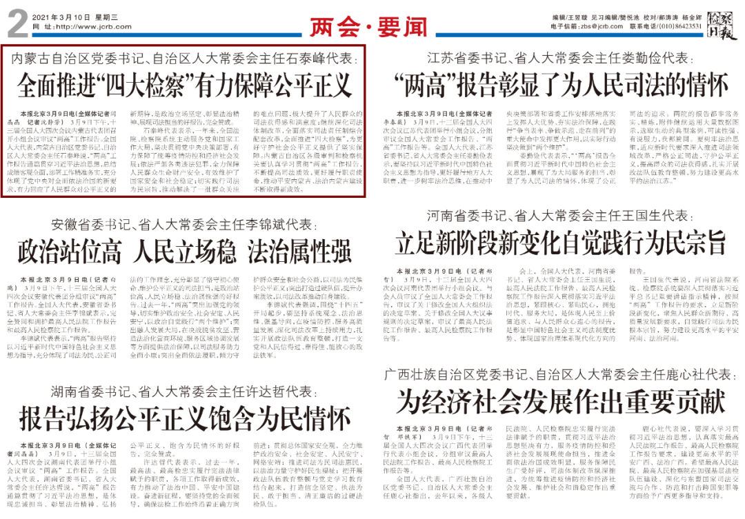 3月10日《檢察日報》第2版——內(nèi)蒙古自治區(qū)黨委書記、自治區(qū)人大常委會主任石泰峰代表:全面推進(jìn)“四大檢察”有力保障公平正義