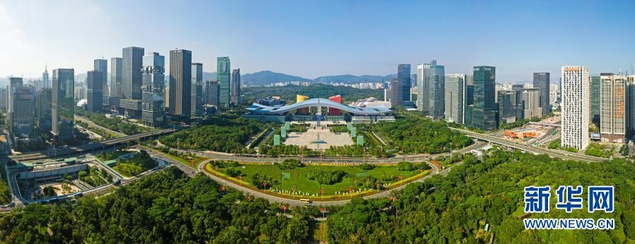 這是2020年10月2日拍攝的深圳市民中心和蓮花山公園一線(無人機照片)。新華社記者梁旭攝