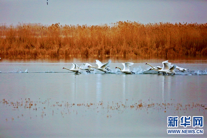 天鵝振翅飛翔。新華網(wǎng) 發(fā)(羅躍忠 攝)