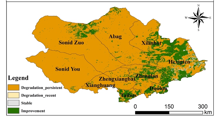 論文通訊作者王鋒研究員進(jìn)一步解釋說(shuō),該評(píng)估框架以16年為評(píng)價(jià)時(shí)段,間隔5年開(kāi)展生態(tài)系統(tǒng)生態(tài)質(zhì)量評(píng)價(jià)。將2000-2015年的生態(tài)質(zhì)量作為參考基線,2005-2020年的生態(tài)質(zhì)量作為現(xiàn)狀,通過(guò)生態(tài)系統(tǒng)現(xiàn)狀質(zhì)量與參考基線質(zhì)量的比較開(kāi)展評(píng)價(jià)。使用歸一化植被指數(shù)、土壤有機(jī)碳和沙塵暴三個(gè)指標(biāo)分別代表植被、土壤和大氣質(zhì)量,每個(gè)指標(biāo)變化包括提高、穩(wěn)定和退化3個(gè)水平。三個(gè)指標(biāo)通過(guò)邏輯運(yùn)算而非權(quán)重計(jì)算獲得生態(tài)系統(tǒng)質(zhì)量指標(biāo)變化,兼顧了不同響應(yīng)速率指標(biāo)變化對(duì)生態(tài)系統(tǒng)質(zhì)量的影響。若三個(gè)指標(biāo)中有一項(xiàng)退化,生態(tài)質(zhì)量指標(biāo)即為退化。