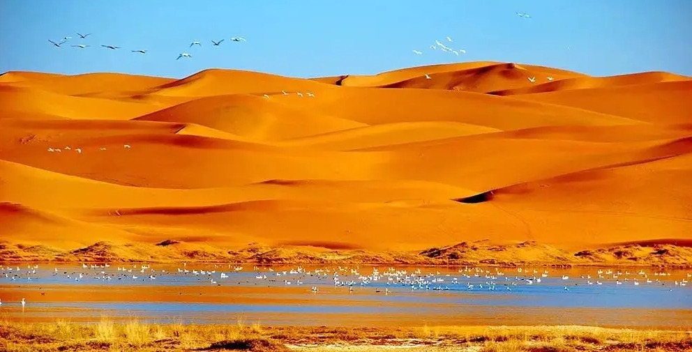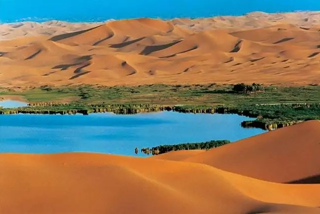 巴丹吉林沙漠年降水量不足40毫米,但是沙漠中的湖泊竟然多達(dá)100多個(gè)。高聳入云的沙山,神秘莫測(cè)的鳴沙,靜謐的湖泊、濕地,構(gòu)成了巴丹吉林沙漠獨(dú)特的迷人景觀,于2005年被《中國國家地理》雜志評(píng)為中國最美麗的沙漠,每年吸引了上萬名國內(nèi)外游客前來觀光。