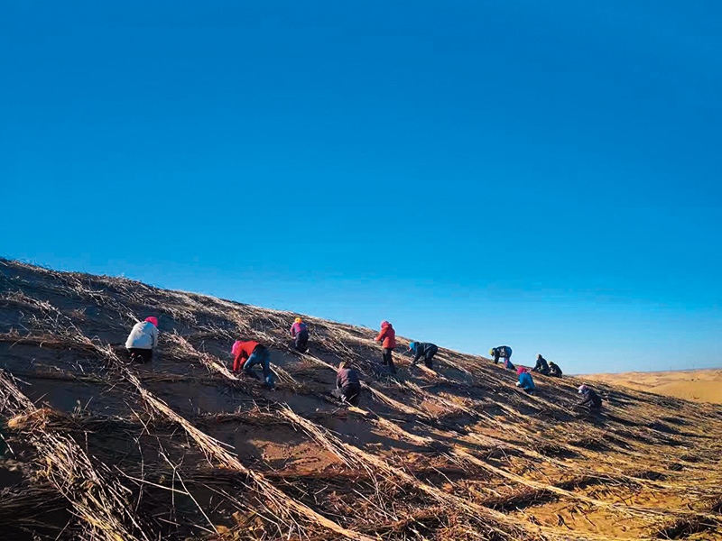 杭錦旗群眾在沙丘上栽設固沙沙障 杭錦旗委宣傳部供圖