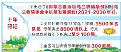 黨的十八大以來,烏蘭牧騎事業(yè)發(fā)展進入快車道。自治區(qū)制定了一系列加快推進烏蘭牧騎事業(yè)發(fā)展的政策,出臺了《內(nèi)蒙古自治區(qū)烏蘭牧騎條例》和《烏蘭牧騎事業(yè)中長期發(fā)展規(guī)劃(2021-2030年)》。設立全區(qū)烏蘭牧騎事業(yè)發(fā)展專項經(jīng)費,為75支烏蘭牧騎配備演出大巴車,新建烏蘭牧騎宮,舉辦烏蘭牧騎藝術節(jié)、全區(qū)烏蘭牧騎新人新作比賽,開展全區(qū)烏蘭牧騎交流演出、“烏蘭牧騎月”等活動,促進烏蘭牧騎互相學習發(fā)展。開發(fā)“網(wǎng)上烏蘭牧騎”PC版網(wǎng)頁和手機版微信H5,成立烏蘭牧騎輔導工作隊、志愿服務工作隊,為基層農(nóng)牧民提供藝術培訓服務。以“烏蘭牧騎+”的方式深入基層,開展理論宣講、電影放映、法律咨詢等綜合志愿服務。加強烏蘭牧騎人才隊伍建設,在錫林郭勒職業(yè)學院等設立烏蘭牧騎人才培訓基地,舉辦全區(qū)烏蘭牧騎隊長培訓班、舞臺藝術創(chuàng)作培訓班等業(yè)務培訓班。組織實施《烏蘭牧騎原創(chuàng)經(jīng)典作品名錄》工作和《全區(qū)烏蘭牧騎原創(chuàng)經(jīng)典作品傳承工程》。編輯出版《烏蘭牧騎回憶錄》《烏蘭牧騎優(yōu)秀作品選》。組織啟動烏蘭牧騎知識產(chǎn)權保護工作。