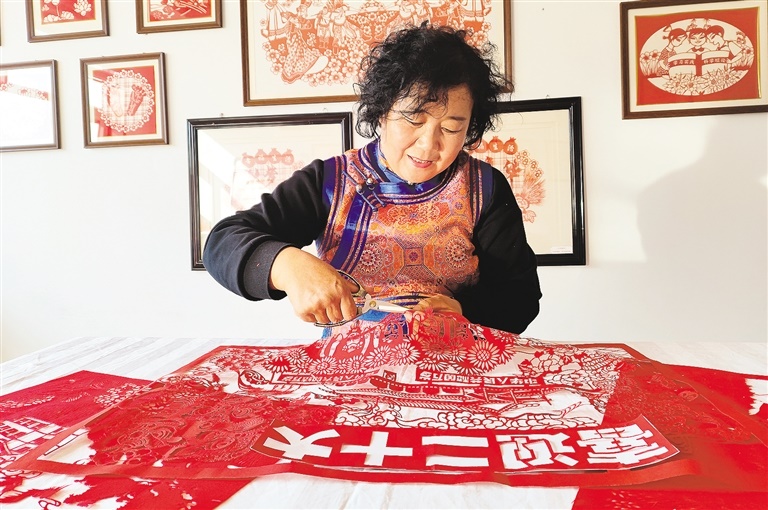 10月15日下午,自治區(qū)非遺剪紙項(xiàng)目傳承人、呼和浩特市土默特左旗畢克齊鎮(zhèn)紅秀剪紙合作社發(fā)起人李還秀在創(chuàng)作慶祝黨的二十大勝利召開系列剪紙作品。連日來,全區(qū)各地群眾通過剪紙、書法等藝術(shù)形式,表達(dá)對盛會(huì)的期盼、對祖國的祝福。記者 鄭學(xué)良 實(shí)習(xí)生 郭亞麗 攝