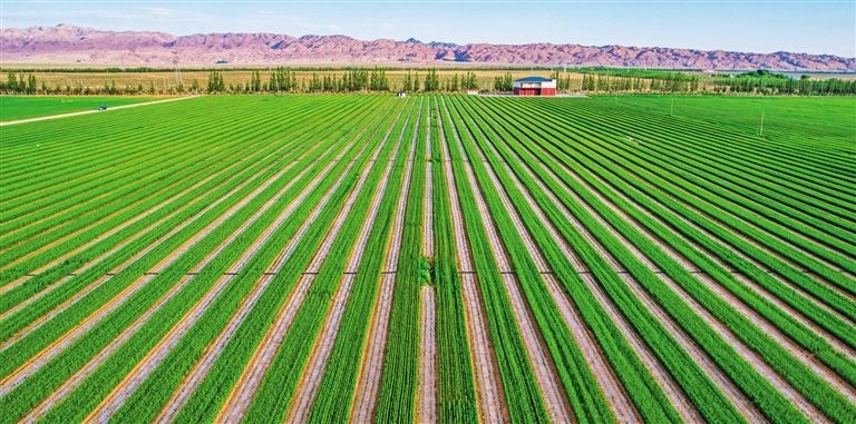 從空中俯瞰,現(xiàn)代農(nóng)業(yè)示范園區(qū)內(nèi),萬(wàn)畝大田宛如一塊綠色的巨型“畫布”。
