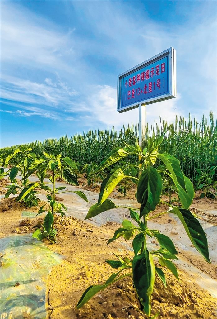 在示范園區(qū)小麥套種辣椒試驗(yàn)田,目之所及,一排排結(jié)滿麥穗的小麥和長(zhǎng)勢(shì)正旺的辣椒錯(cuò)落有致,生機(jī)盎然。