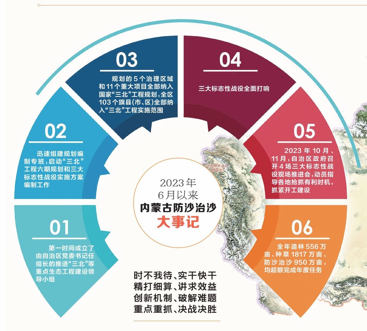 猶記得2023年的6月,習(xí)近平總書記親臨內(nèi)蒙古考察,主持召開了加強荒漠化綜合防治和推進(jìn)“三北”等重點生態(tài)工程建設(shè)座談會,發(fā)出堅決打好“三北”工程攻堅戰(zhàn)、努力創(chuàng)造新時代中國防沙治沙新奇跡的動員令,并親自部署了“三北”工程三大標(biāo)志性戰(zhàn)役。